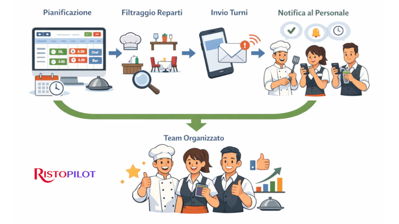 Con Gestione turni personale ristorante di Risto Pilot costruisci la settimana in modo flessibile, filtrando per reparto, assegnando orari e ruoli, e poi puoi inviare una notifica turni a chi deve riceverla. Risultato? Turnazione chiara, meno messaggi “a raffica” e più controllo in una sola dashboard. 🙂