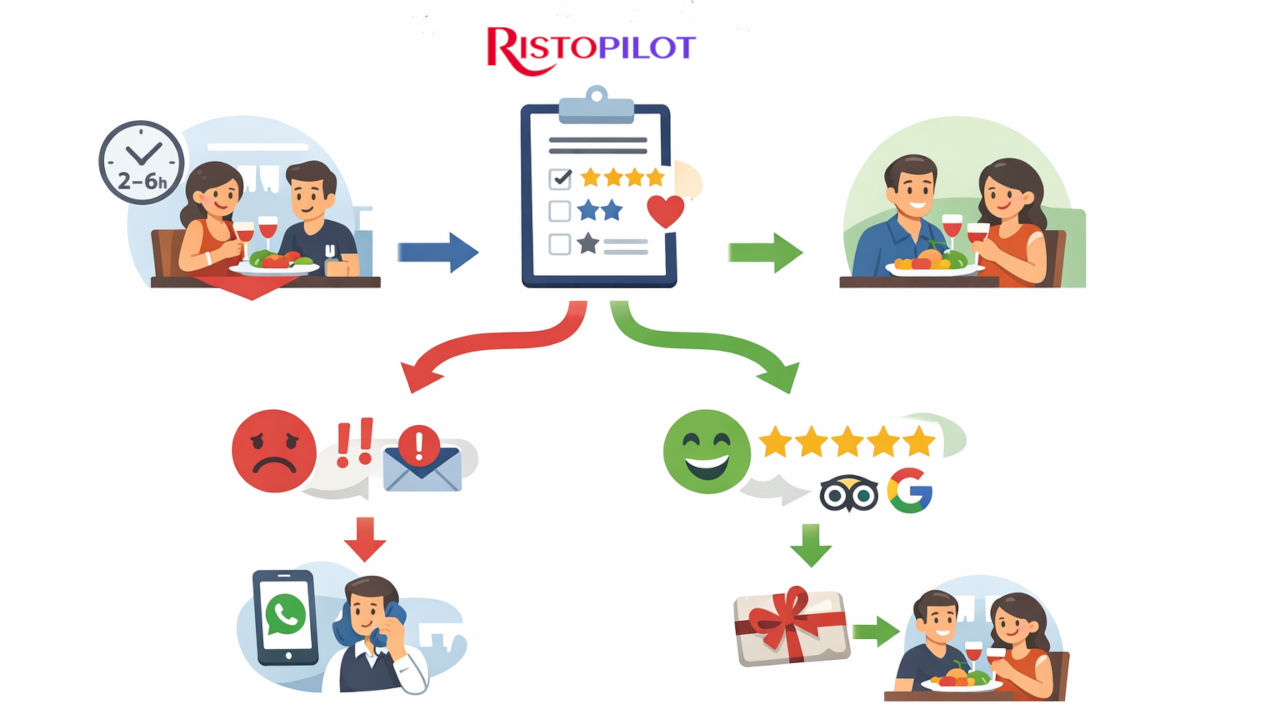 Raccogli feedback, riduci recensioni negative online e aumenta la tua reputazione con Risto Pilot ⭐️🛡️