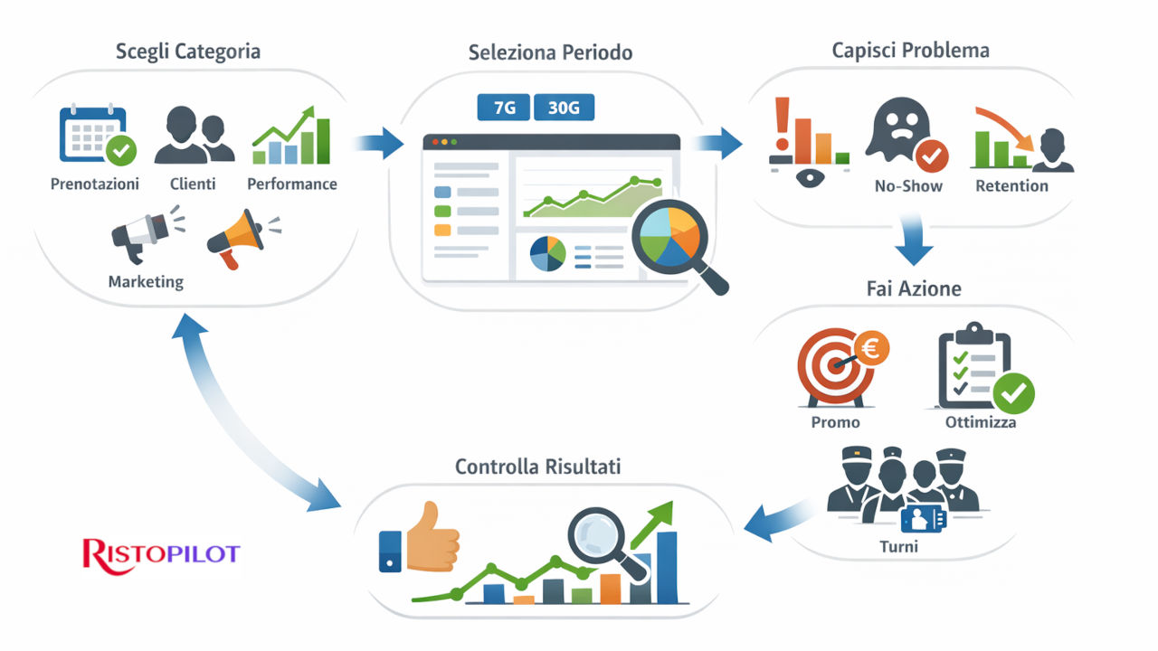 Obiettivo pratico: trasformare dati “sparsi” (prenotazioni, clienti, cassa e marketing) in un andamento ristorante misurabile: capire cosa funziona, cosa va sistemato e dove intervenire per aumentare coperti, efficienza e margine (senza complicarti la vita). 🙂