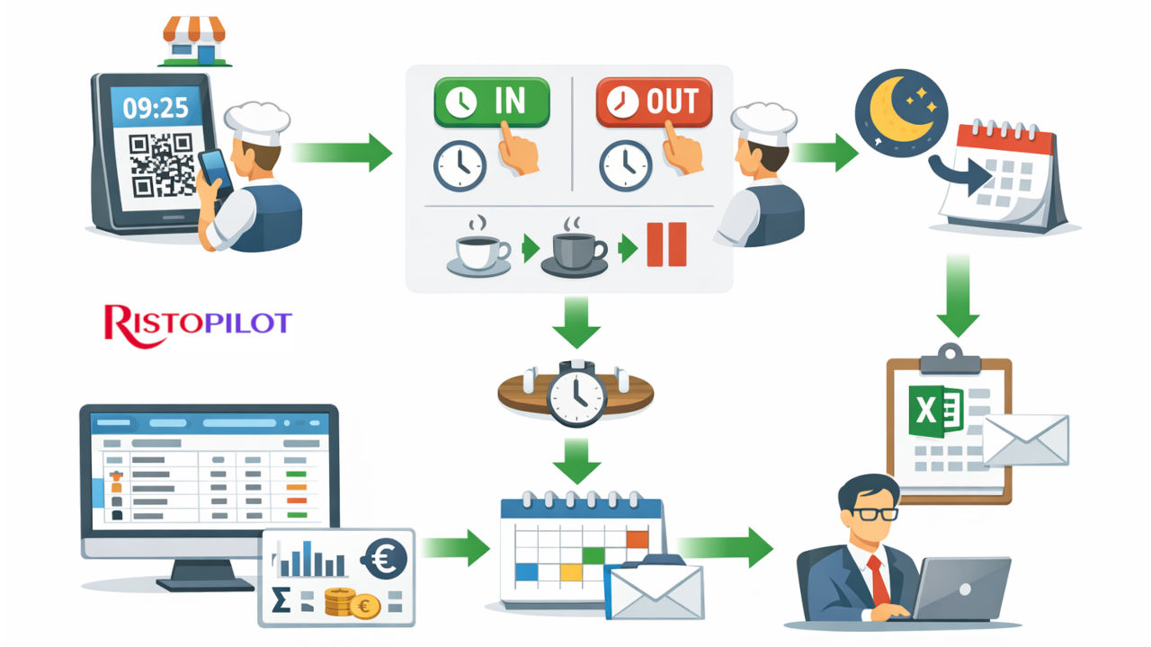 Nel servizio non si perde tempo solo “in sala”: si perde tempo anche prima e dopo. Chi ha iniziato? Chi è in pausa? Quante ore sono state fatte davvero? E soprattutto: quanto è costato quel turno?